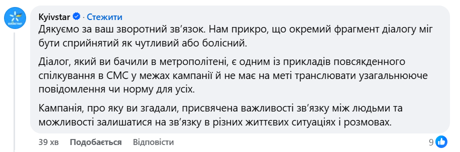 Команда Kyivstar відреагувала на публіцікацію. «Нам прикро, що окремий фрагмент діалогу міг бути сприйнятий як чутливий або болісний. Діалог, який ви бачили в метрополітені, є одним із прикладів повсякденного спілкування в СМС у межах кампанії й не має на меті транслювати узагальнююче повідомлення чи норму для усіх. Кампанія, про яку ви згадали, присвячена важливості зв’язку між людьми та можливості залишатися на зв’язку в різних життєвих ситуаціях і розмовах», – йдеться у повідомленні.