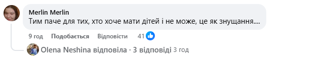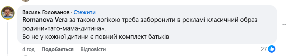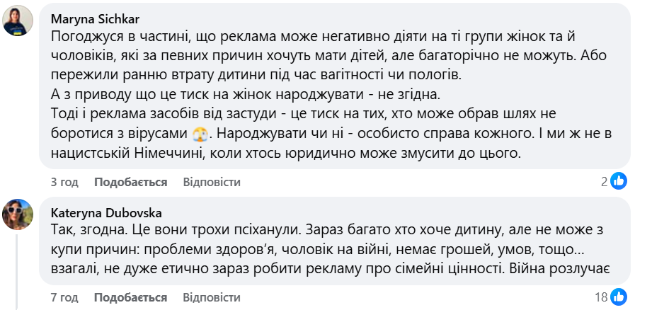 Деякі українці підтримали позицію експертки, наголосивши на відповідальності бізнесу за сенси, які транслюються у публічному просторі, особливо коли вони можуть сприйматися як репродуктивний тиск. Окремі коментатори вказали, що подібні меседжі можуть бути болісними для різних груп людей. «Для тих, хто хоче мати дітей і не може, це як знущання», – пишуть у соцмережі.