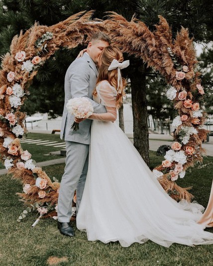 На свято Настя одягла білу сукню з прозорими рукавами та об'ємною спідницею з невеликим шлейфом. У свою чергу Соколюк надів світло-сірий костюм.