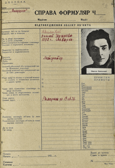 Всього у добірці 50 документів. В анкеті у справі-формулярі, яку чекісти завели на Хвильового, наявні усього кілька відомостей про письменника: рік та місце народження, адреса, професія та прізвисько.