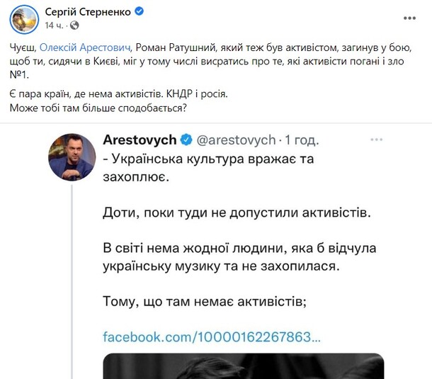 «Є пара країн, де нема активістів. КНДР і Росія. Може тобі там більше сподобається?», – звернувся до Арестовича громадський діяч Сергій Стерненко.