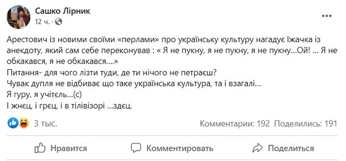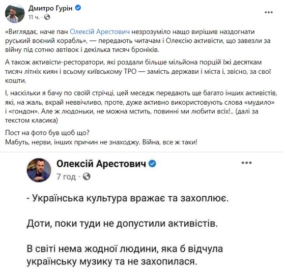 Також Арестович упевнений, що «хороші росіяни» можуть поповнити людський ресурс, який Україна втрачає через війну. Ця заява речника Банкової спровокувала скандал у соцмережах, відомі культурні та політичні діячі різко відреагували на слова Арестовича про «маленьку культуру».