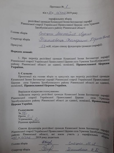«На зборах розглядалося питання щодо переходу вищезазначеної релігійної громади до єдиної, помісної, канонічної (визнаної Константинополем) Православної церкви України (тобто приймалося рішення про зміну підлеглості). Присутні - 58 членів релігійної громади. «За» перехід в ПЦУ - 58 осіб, присутніх на парафіяльних зборах», - повідомив посадовець у Facebook.