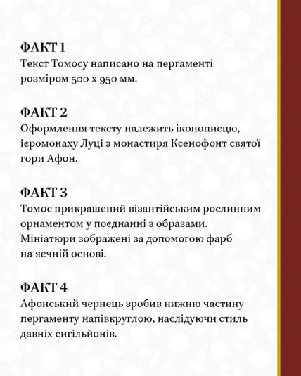 Текст Томосу написано на пергаменті розміром 500х950 мм.