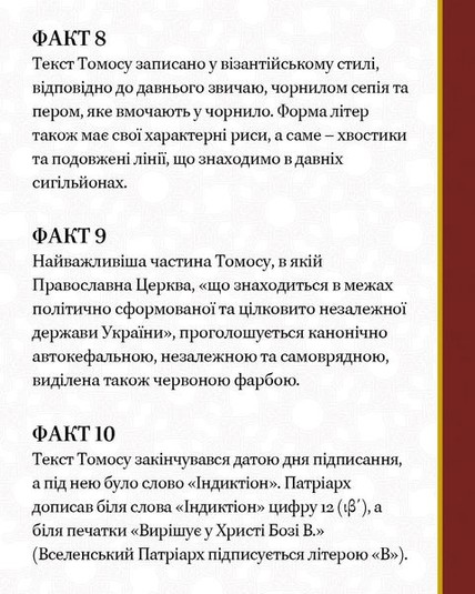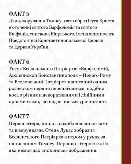 6 січня 2019 року у храмі святого Георгія в Константинополі Вселенський Патріарх урочисто, офіційно і навічно вручив Предстоятелю Православної Церкви України Митрополиту Епіфанію Томос про автокефалію Української Церкви. В честь цього свята Українська православна церква підготувала 10 цікавих фактів про такий омріяний Україною Томос.