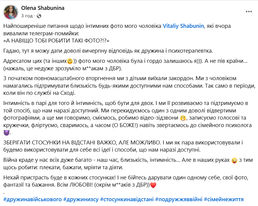 «Адресатом цих (та інших) фото мого чоловіка була і гордо залишаюсь я. А не пів країни… З початком повномасштабного вторгнення ми з дітьми виїхали за кордон. Ми з чоловіком намагались підтримувати близькість будь-якими доступними нам способами. Так само в періоди, коли він по службі на Сході», – йдеться у дописі.