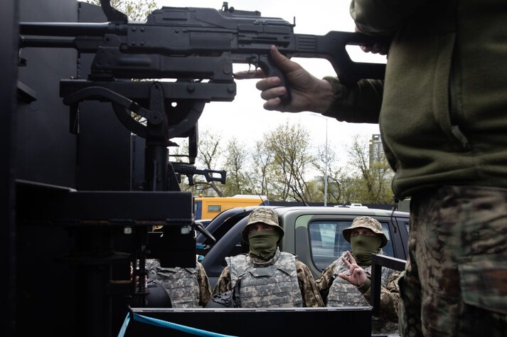 «Тут знаходяться закуплені нами 16 автомобілів, два ми вже передали. Сьогодні ці підуть в десантні бригади, в наші десантно-штурмові війська. Тут також стоять бронекапсули, кулемети. Вони в такому вигляді підуть на фронт», – показує Порошенко.