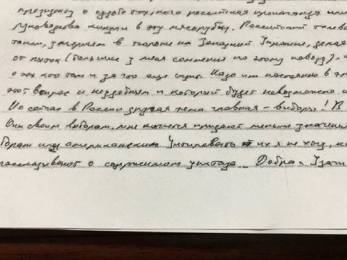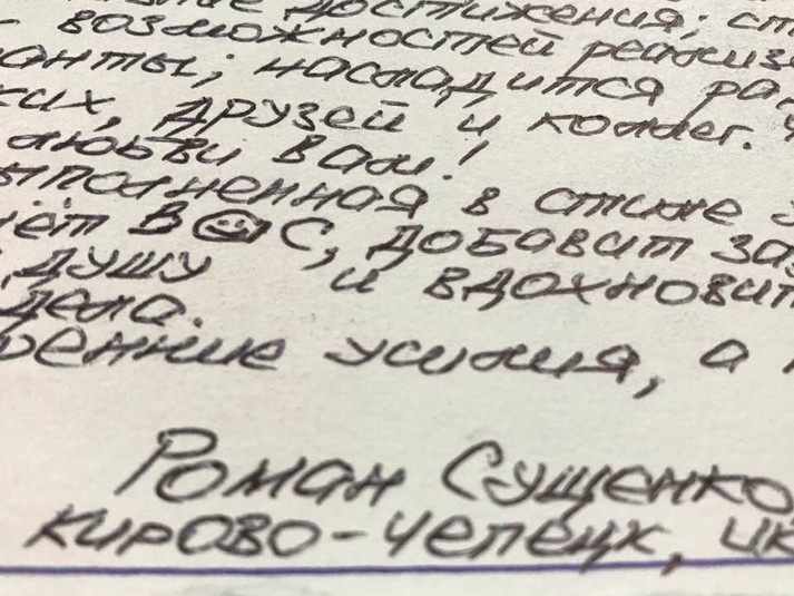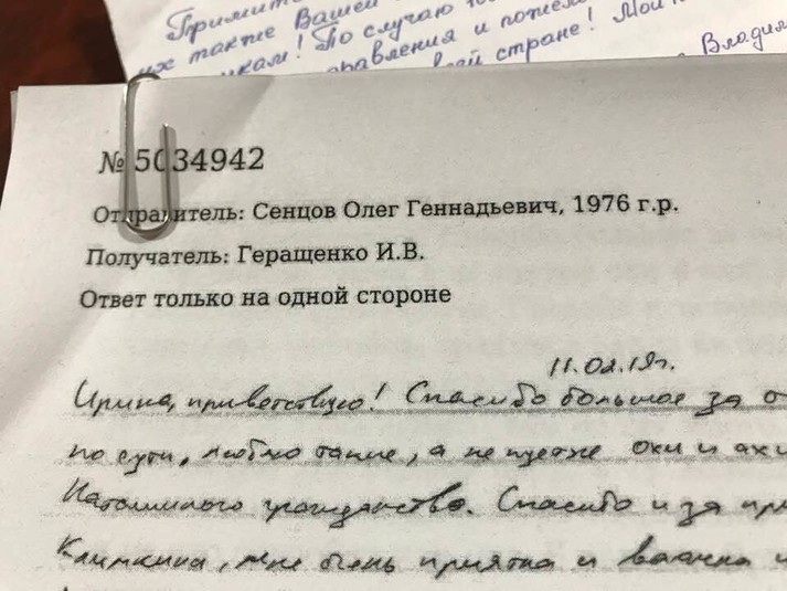 «Я дуже чекаю цих листів. Й щоб знати, як вони там, в ізоляції. І тому, що вони надають сил. В листах Олега Сенцова - завжди стільки життя, надії... й що найдивовижніше - він не втрачає почуття гумору, яке, мабуть, там рятує. В Олега, як в усіх творчих людей, складний почерк. А от у Миколи Карпюка - почерк ідеальний, так пишуть вчителі української мови і історії», - зазначила перший віце-спікер.
