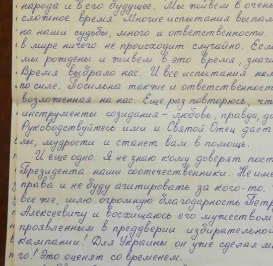 «Всі випробування нам під силу. Під силу також і відповідальність, що покладена на нас. Інструмент розвитку - любов, правда, добро! Керуйтеся ними», - написав Карпюк у листі.