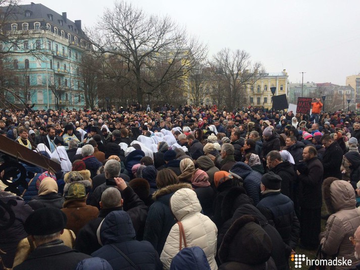 Як повідомляє Громадське, учасники акції скандують «Архітекторів на волю!», «Росія геть з України!» та «Геть московського попа!».