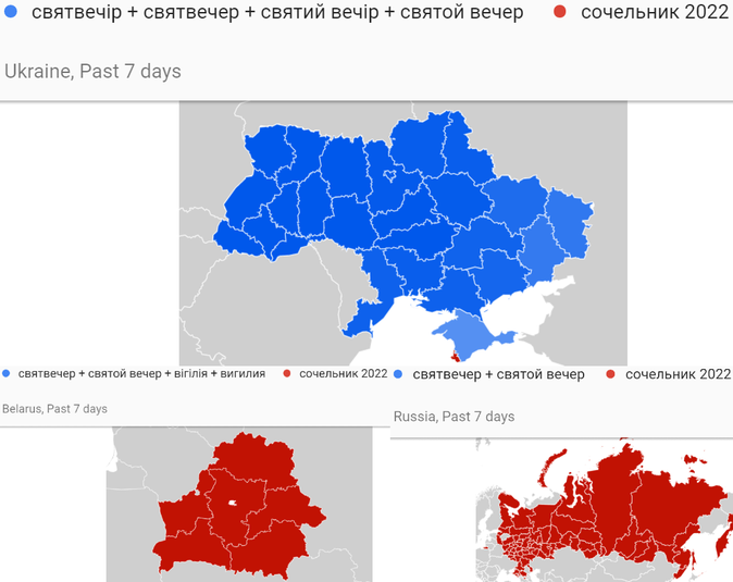 Також за останній тиждень святвечір/святий вечір витіснив «сочельник 2022» на всій Україні (за вийнятком Севастополя), тоді як в Росії і Білорусі «сочельник 2022» всюди дуже переконливо переміг.