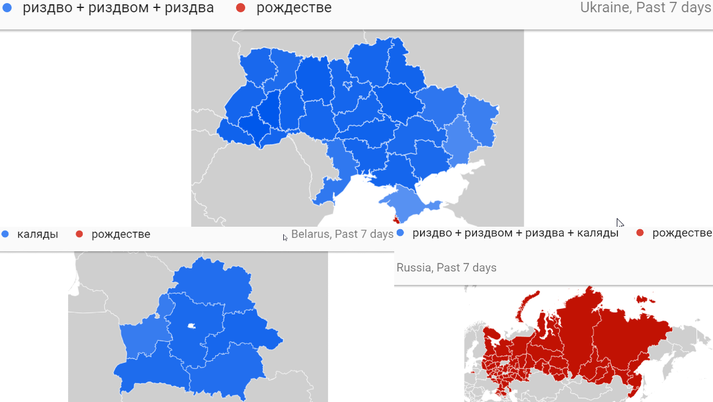 «Чергова ілюстрація культурної окремішности України і Білорусі від РФ – на перший погляд російськомовні слова «риздво» в Україні і «каляды» в Білорусі повністю (за вийнятком Севастополя) витіснили запит «рождестве», що переміг по всій Росії», – йдеться у повідомленні.