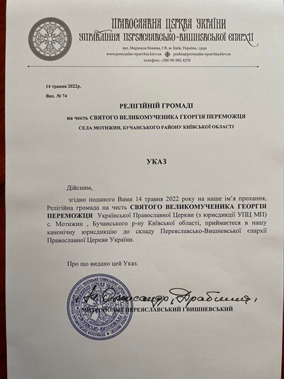 14 травня до Переяславсько-Вишневськоі єпархії Православноі Церкви України приєдналася парафія святого великомученика Георгія Побідоносця (з юрисдикції УПЦ МП) села Мотижин, Бучанського району, Київської області. Про це повідомив митрополит Православної церкви України Олександр Драбинко.