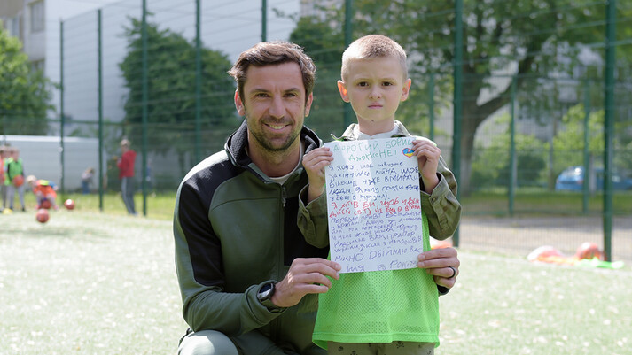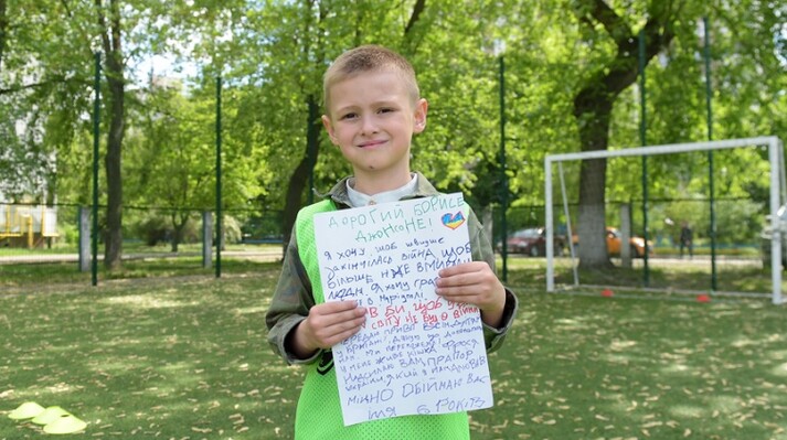 Я хочу, щоб швидше закінчилася війна, щоб більше не вмирали люди. Я хочу грати у футбол у себе в Маріуполі. Я хотів би, щоб у всіх дітей світу не було війни. Передаю привіт усім дітям у Британії, дякую, що допомагаєте нам. Ми переможемо! У мене живе кішка Фрося. Надсилаю Вам прапор України, який я намалював. Міцно обіймаю Вас.