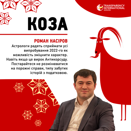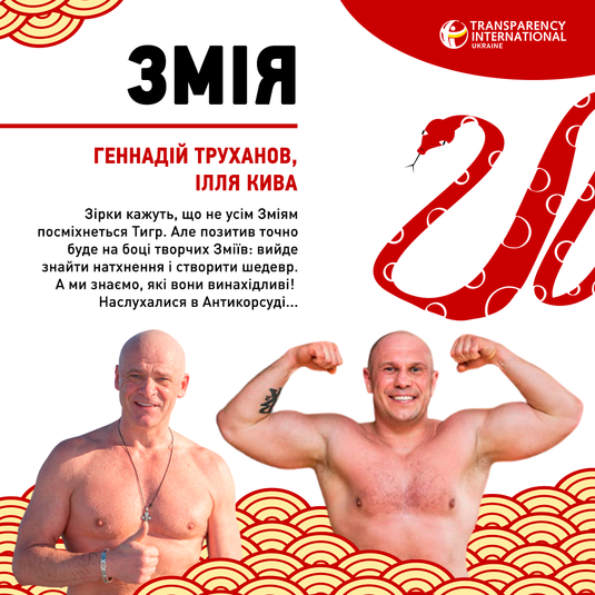 «Зірки кажуть, що не усім зміям посміхнеться тигр. Але позитив точно буде на боці творчих зміїв: вийде знайти натхнення і створити шедевр. А ми знаємо, які вони винахідливі. Наслухалися в Антикорсуді», – зазначили в організації Transparency International Ukraine та доповнили текст світлинами Іллі Киви та Геннадія Труханова.