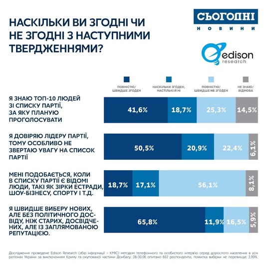 Соціологи зазначають, що 41,6% опитаних знають топ-10 осіб зі списку партії, за яку планують проголосувати, 25,3% не знають. Лідеру обраної партії довіряють 50,5% респондентів.