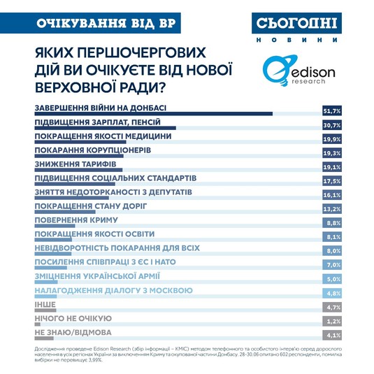 Стосовно очікувань від нової Верховної Ради, то українці хочуть завершення війни на Донбасі (51,7%) і підвищення зарплат і пенсій (30,7%). Значно менше чекають зміцнення української армії (5,0%) та налагодження діалогу з Москвою (4,8%). Нічого не очікують від нової влади 1,2% опитаних.