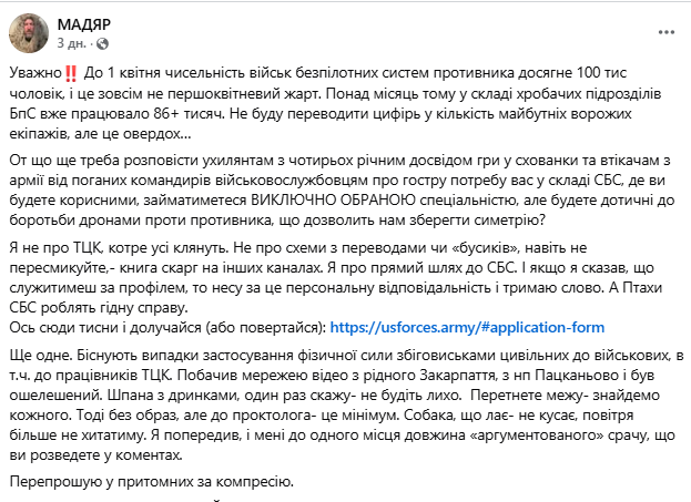 Командувач Сил безпілотних систем Збройних Сил України Роберт Бровді, відомий за позивним Мадяр заявив, що його слова у соцмережах просто перекрутили. Жодної погрози цивільним там не було. Про це повідомляє «Главком» з посиланням на допис Роберта Бровді.