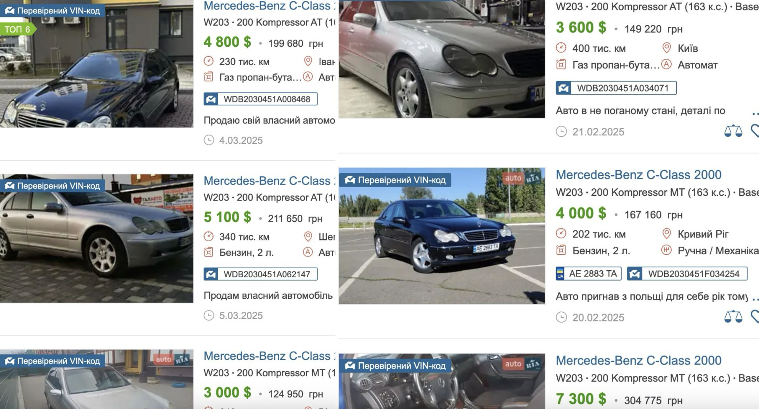 А ринкова вартість Mercedes-Benz C200, 2000 року випуску стартує від $3 тис.