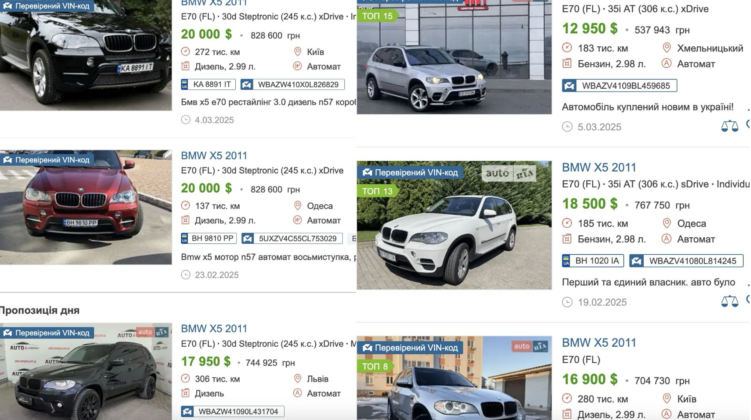 Для порівняння: на сайтах із продажу автівок станом на березень 2025 року BMW X5, 2011 року коштує від $11 тис. до $20 тис., залежно від стану транспортного засобу, комплектації тощо.