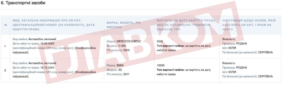 Окрім того, у 2023 році посадовиця також купила ще один легковий автомобіль за ще меншу суму. Йдеться про Mercedes-Benz C200, 2000 року випуску, який за 3 тис. грн обійшовся Юлії Родіній.