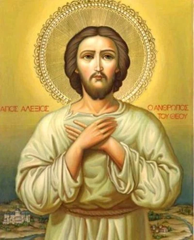 Святий Олексій жив наприкінці IV – на початку V століття. Він народився в Римі у побожній та багатій родині сенатора. У ніч після свого весілля Олексій таємно залишив дім, відплив до Месопотамії та оселився в місті Едесса. Там він роздав усе своє майно бідним і протягом 17 років жив як жебрак біля входу до храму Пресвятої Богородиці, харчуючись лише хлібом і водою та проводячи ночі в молитві.
