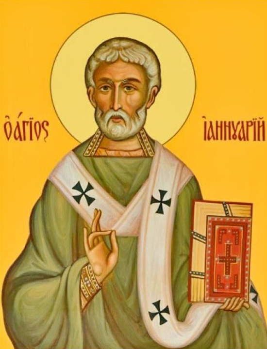 Святий Януарій був єпископом італійського міста Беневенто. Під час жорстоких гонінь імператора Діоклетіана він безстрашно відвідував ув’язнених християн, підтримуючи їхню віру. За це єпископа та його вірних помічників – дияконів Соссія, Прокула, Фавста та інших – було схоплено. Попри катування та спроби стратити їх через спалення чи диких звірів, святі залишалися неушкодженими. Вражений народ навертався до Христа, бачачи такі чудеса. Зрештою, мученики прийняли смерть від меча, залишивши по собі пам'ять як про незламних воїнів Христових.