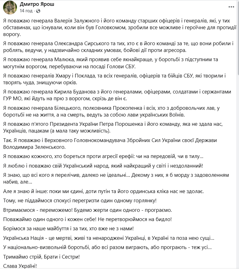 Дмитро Ярош також додав: «Я поважаю генералів Хмару і Поклада, та всіх генералів, офіцерів та бійців СБУ, які творили і творять чуда, знищуючи орків. Я поважаю генерала Кирила Буданова з його генералами, офіцерами, солдатами і сержантами ГУР МО, які йдуть на прю з ворогом, скрізь де він є. Я поважаю генерала Білецького, полковника Прокопенка і всіх, хто з добровольчих лав, у боротьбі не на життя, а на смерть, ведуть за собою лави українських Воїнів. Я поважаю пʼятого президента України Петра Порошенка і його команду, яка не здала нас, Українців, пацакам (а мала таку можливість). Так. Я поважаю і верховного головнокомандувача Збройних Сил України своєї держави Володимира Зеленського».