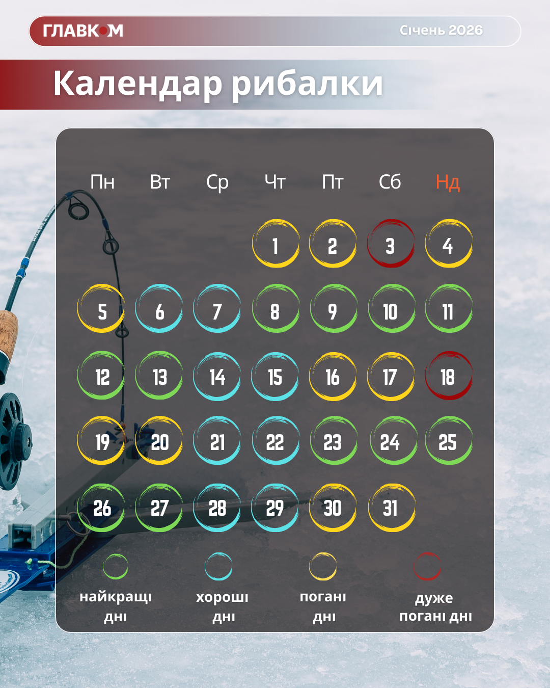 «Главком» підготував календар рибалки на січень 2026 року, який допоможе спланувати поїздки, обрати правильні снасті та визначити найкращі дні для риболовлі.