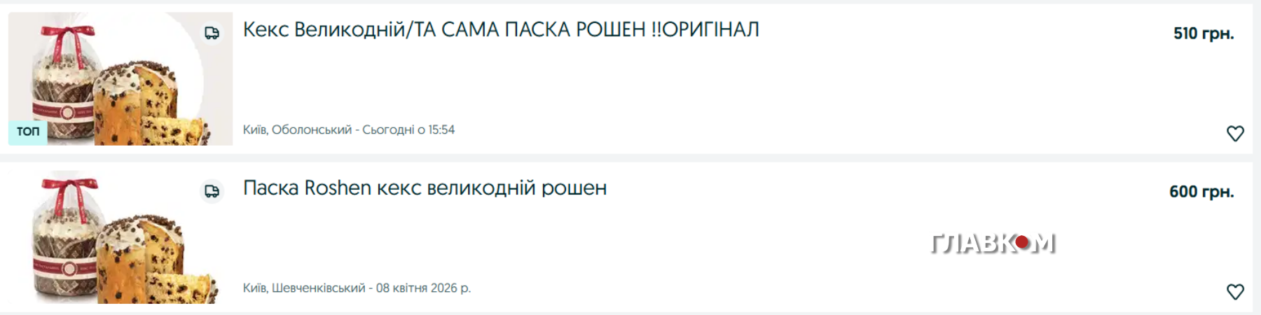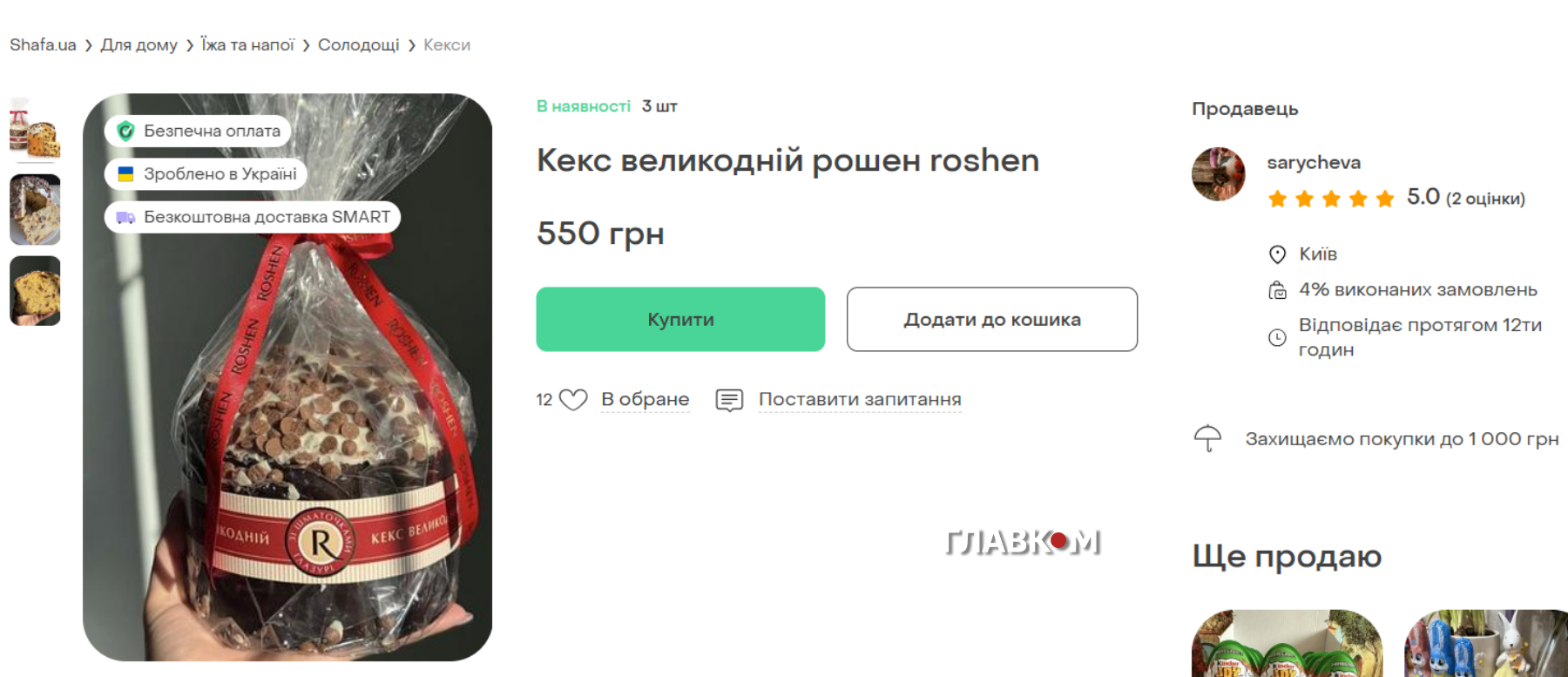 Подібні пропозиції з’являються і на інших сервісах. Так, на сайті shafa великодній кекс виставляють на продаж у середньому за 550 грн, що майже вдвічі перевищує початкову ціну.
