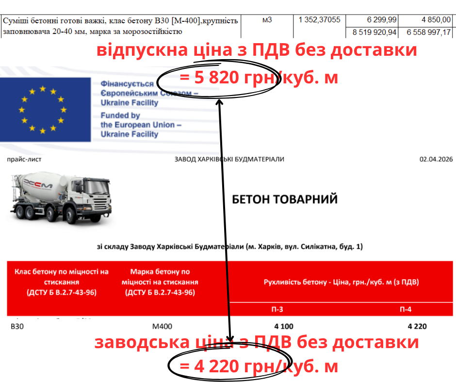 Попри це, підлеглі ОВА провели тендер і визначили підрядника. У кошторисі зафіксовані завищені ціни на окремі матеріали. Зокрема, бетон В30 закладений по 5 820 грн за кубометр, тоді як ринкові ціни становлять 4 100–4 660 грн, що на 20–28% дешевше.