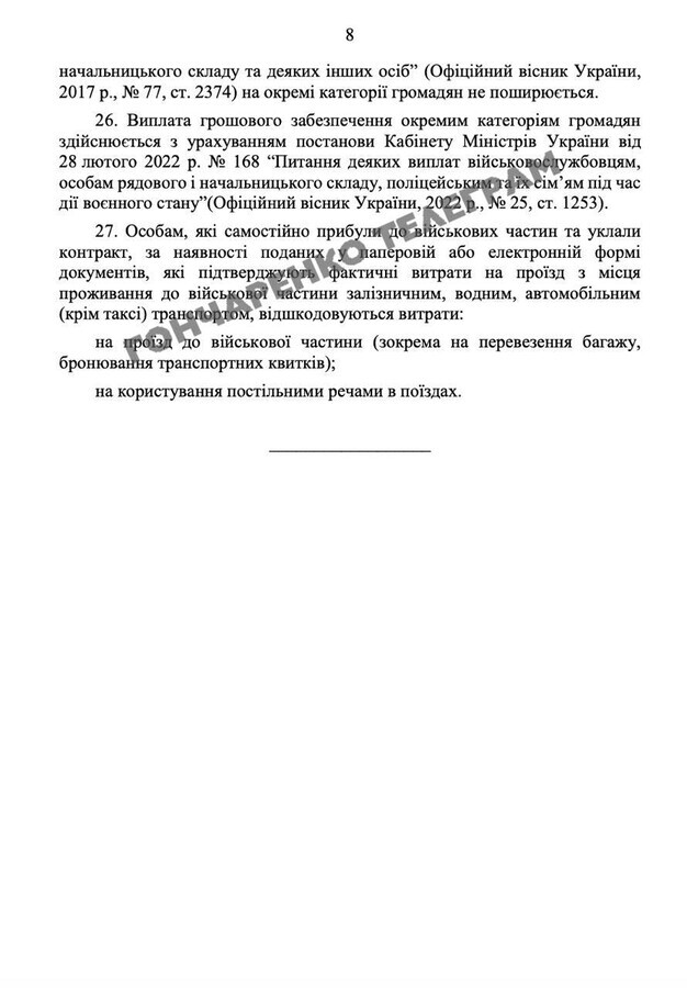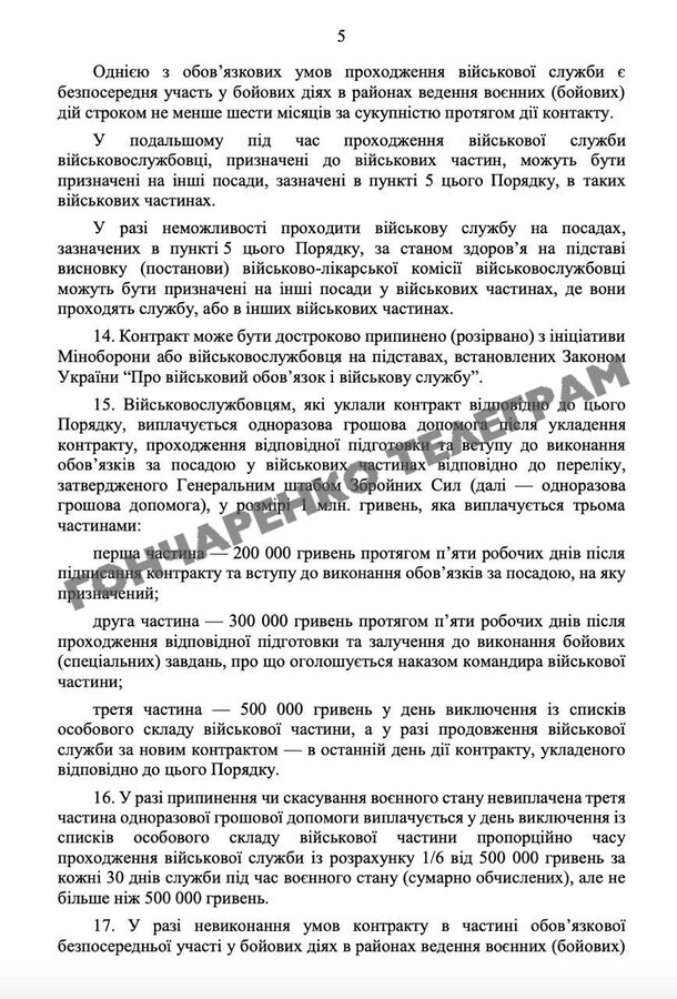- друга частина – 300 тис. гривень протягом п’яти робочих днів після проходження відповідної підготовки та залучення до виконання бойових (спеціальних) завдань, про що оголошується наказом командира військової частини;