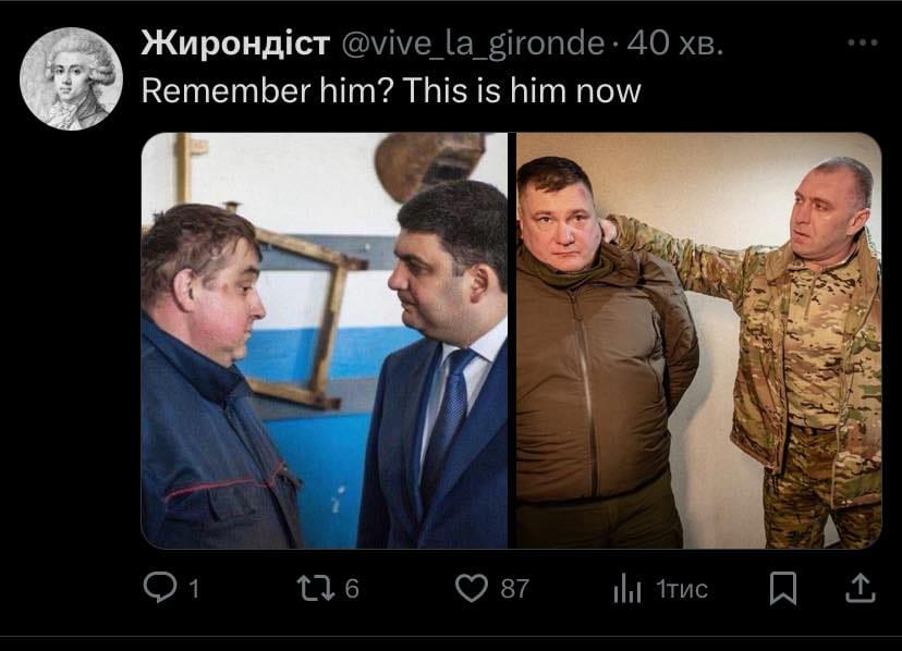 Тут ж українці порівнюють затримання «щура» з фото, на якому колишній прем’єр-міністр України Володимир Гройсман розмовляв з невідомим працівником. На фотографії Гройсман чи то розлючений, чи то просто зосереджений, тоді як його співрозмовник збентежений або розгублений.