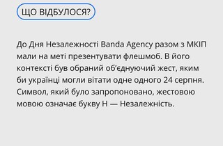 До слова, рекламна агенція Banda Agency, яка сьогодні, 22 серпня, запустила разом із Міністерством культури та інформаційної політики України на честь річниці Незалежності України флешмоб і втрапила через це в скандал, вибачилася за промах. Але робити це довелося двічі, адже з першого разу вийшло так собі.