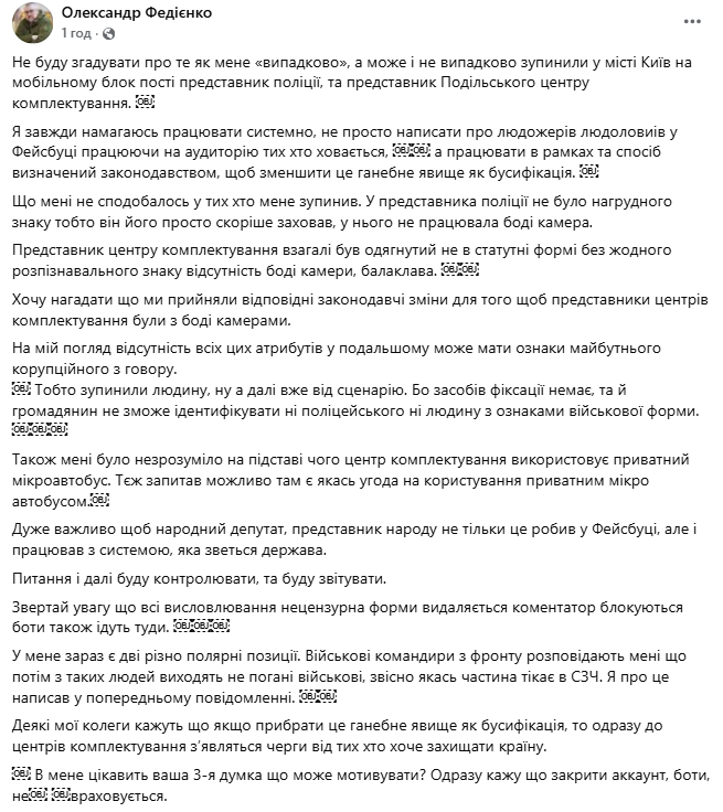 Депутат також заявив про порушення з боку представника територіального центру комплектування. «Представник центру комплектування взагалі був не в статутній формі без жодного розпізнавального знаку, відсутність бодікамери, балаклава», – написав Федієнко.