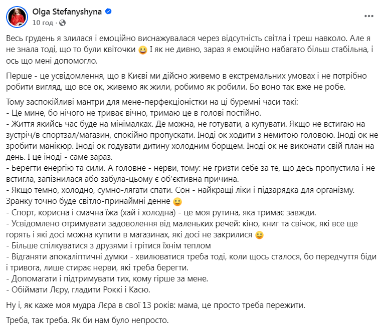 Народна депутатка України та колишня заступниця міністра охорони здоров'я Ольга Стефанишина оприлюднила допис, у якому поділилася власним досвідом життя під час регулярних відключень електроенергії в Києві та пояснила, що допомагає їй зберігати емоційну стабільність. Про це повідомляє «Главком» з посиланням на допис нардепки у Facebook.