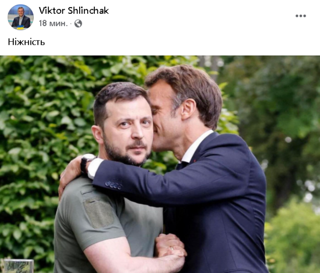 На фото Володимир Зеленський упевнено дивиться в кадр, а Макрон тисне йому руку та дружньо плескає по плечу.