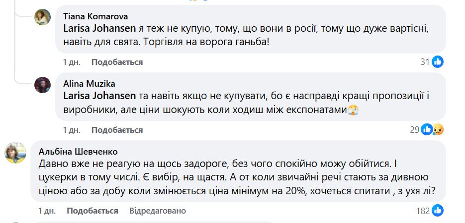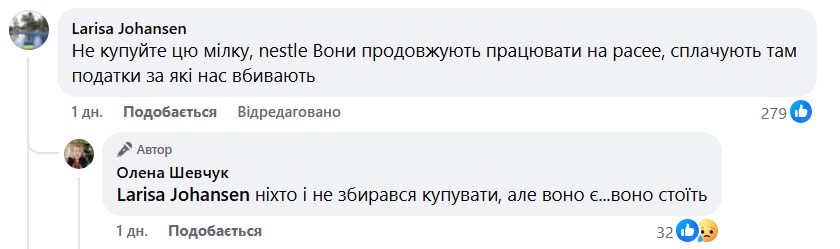 Зокрема, користувачка Лариса Йохансен закликала не купувати цю продукцію: «Не купуйте цю Мiлку, Nestle. Вони продовжують працювати у Росії, сплачують там податки, за якi нас вбивають». Олена Шевчук зазначила, що ніхто й не збирався купувати, але сам факт наявності такої ціни є обурливим.