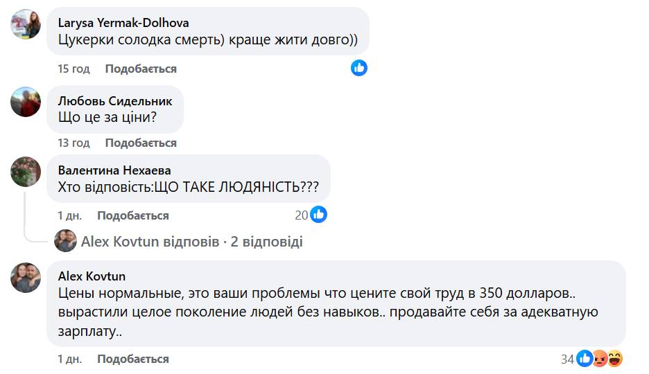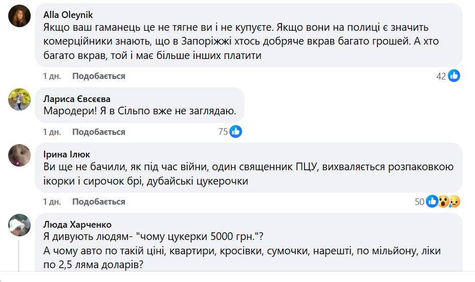 «Я дуже добре пам'ятаю одного дорослого пораненого хлопчика, такого віку, як я У нього було перебито дві руки і я приїжджала його годувати. Так він розповідав, що два тижні з хлопцями їли лише рибні консерви, бо більше нічого не було, в машину з продуктами потрапив дрон і вціліли лише ці консерви. А тут цукерки за 5000 гривень...може я чогось не розумію?», – написала жінка.