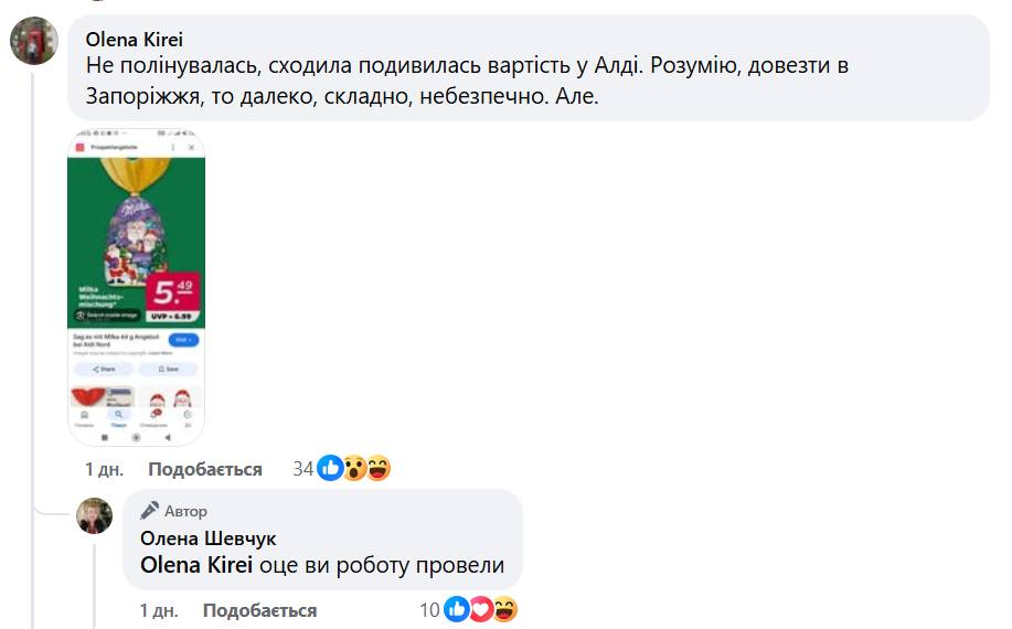 Скандал також підкреслив величезну різницю в цінах порівняно з Європою: одна з дописувачок повідомила, що у німецькій мережі Aldi аналогічний набір можна придбати лише за 5,49 євро. Курс євро 16 грудня становить 49,66 грн, тож набір цукерок у Німеччині коштує 273 грн.