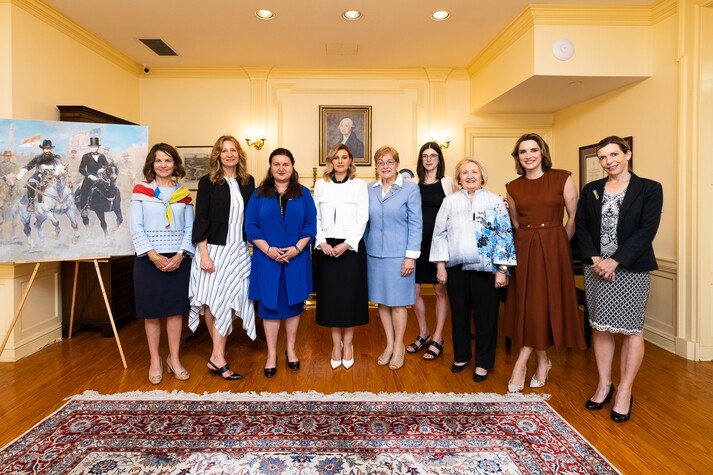 Інший чорно-білий комплект від A.M.G. Brand Олена Зеленська обрала для зустрічі з американськими дипломатками, конгресвумен та журналістками.