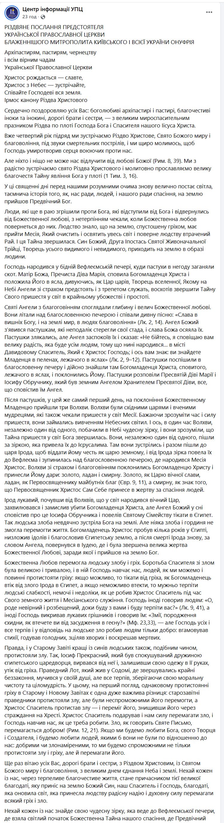 У тексті послання митрополита Онуфрія, опублікованому Центром інформації УПЦ, є дивний заклик. «Вже четвертий рік підряд ми зустрічаємо Різдво Христове, Свято Божого миру і благовоління, під звуки смертельних пострілів, і ми щиро молимось, щоб Господь умиротворив серця воюючих проти нас», – йдеться у повідомленні. Хто ці воюючі Онуфрій конкретно не називає. Кожен може підставити потрібне сам.