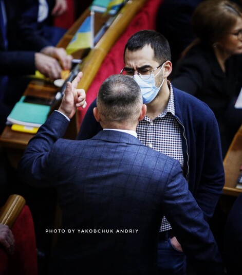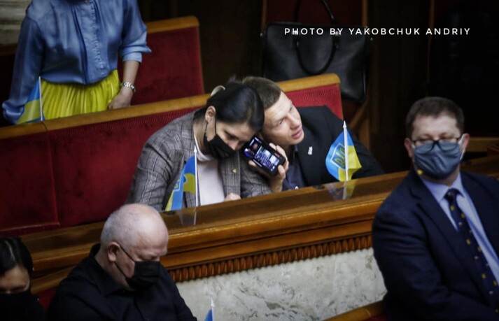 Кожен із депутатів при своєму ділі. Хтось вирішує економічні питання, як голова комітету Верховної Ради з питань фінансів, податкової та митної політики Данило Гетманцев. Хтось уважно обговорює політичні події по телефону, як народний депутата «Європейської солідарності» Олексій Гончаренко з колегою по фракції. При цьому депутати використовують один гаджет на двох.