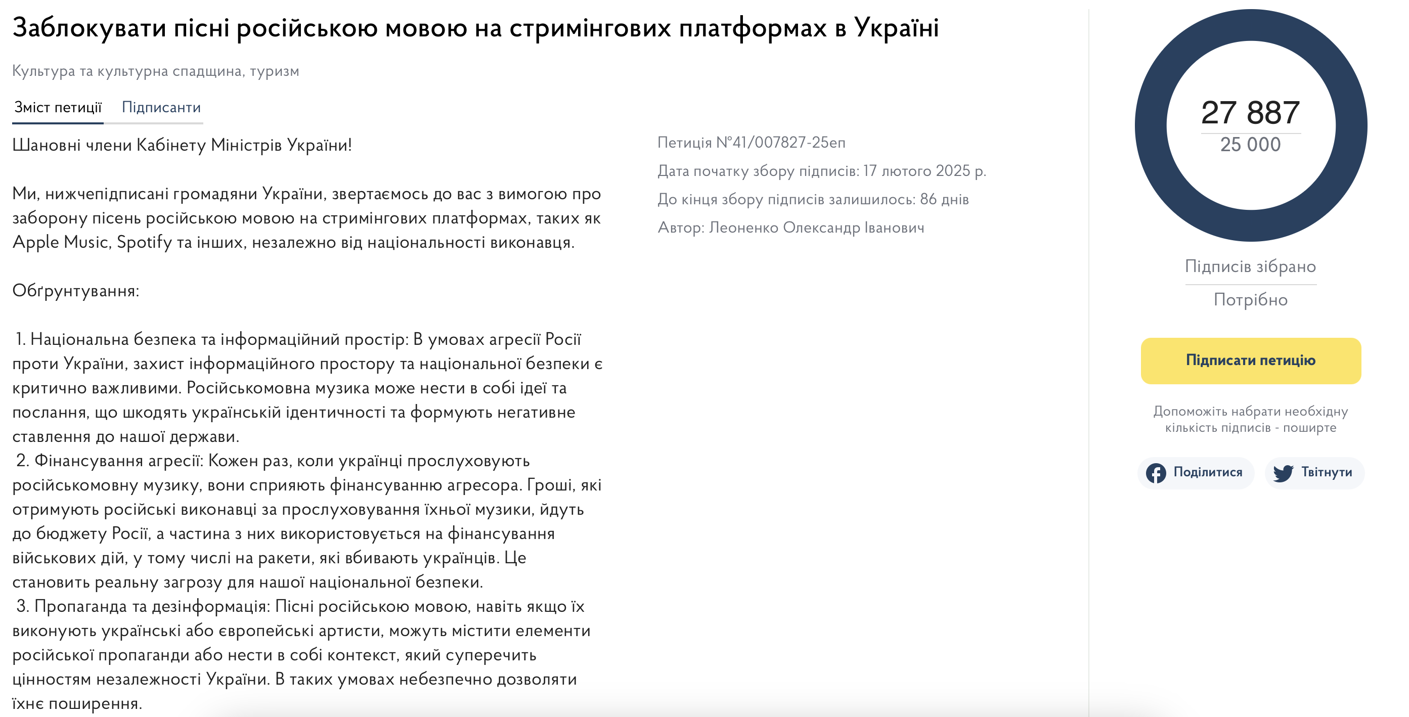 Петиція про блокування музики російською мовою на стримінгових платформах в Україні назбирала необхідні 25 тис. голосів за три дні. Петиція з'явилася на сайті Кабінету міністрів 17 лютого. Станом на четвер, 20 лютого, її підписали вже майже 28 тис. користувачів.