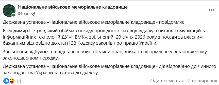 «Володимир Петров, який обіймав посаду провідного фахівця відділу з питань комунікацій та інформаційних технологій ДУ «НВМК», звільнений 20 січня 2026 року з посади за власним бажанням відповідно до статті 38 Кодексу законів про працю України. Звільнення відбулося на підставі особистої заяви працівника та оформлене у встановленому законодавством порядку», – йдеться у повідомленні.