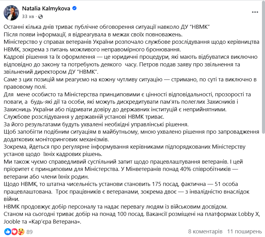 Очільниця Міністерства у справах ветеранів Наталія Калмикова нагадала, що відомство розпочало службове розслідування щодо керівництва НВМК, зокрема з питань можливого неправомірного бронювання. «Кадрові рішення та їх оформлення – це юридичні процедури, які мають відбуватися виключно відповідно до закону та потребують деякого часу. Петров подав заяву про звільнення та звільнений директором ДУ «НВМК». Саме з цих позицій ми реагуємо на кожну чутливу ситуацію – стримано, по суті та виключно в правовому полі», – наголосила вона.