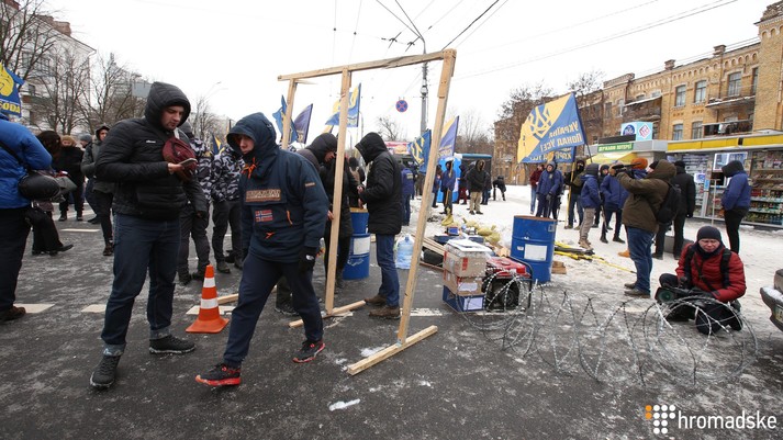 Вулиця повністю перекрита, стоять сітки та кордони силовиків