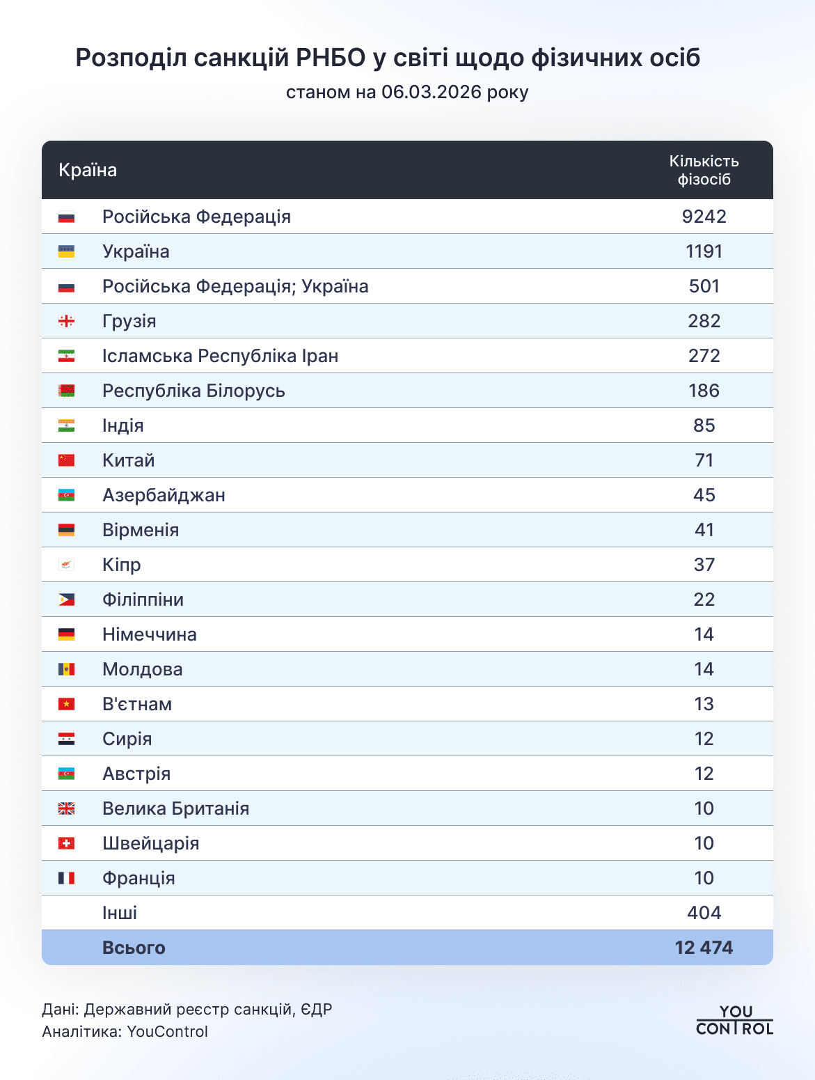 Загалом під санкціями РНБО перебувають 12 474 фізичні особи зі 77 країн. Найбільше серед них громадян Росії – 9 242, а також українців – 1 191. Середній вік підсанкційної особи становить 54 роки.