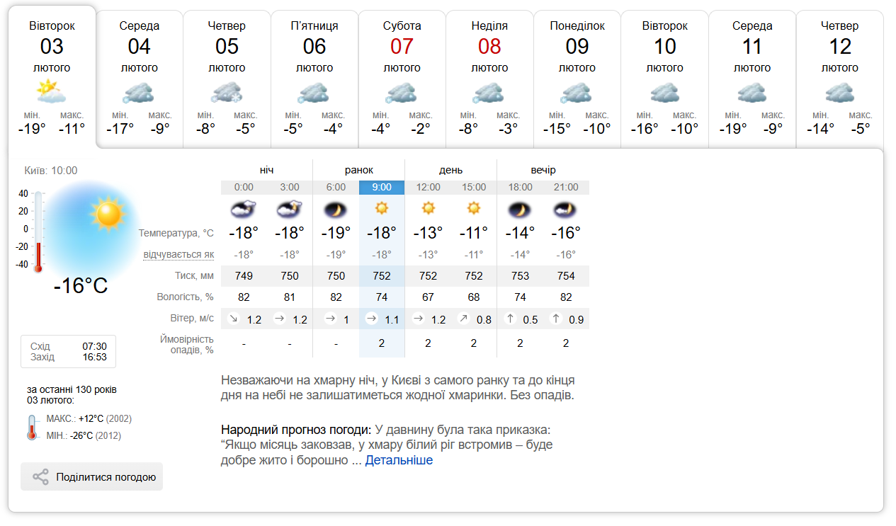 Водночас за даними іншого метеорологічного ресурсу, 11 лютого зниження температури буде менш різким – очікується близько -10 градусів°С.