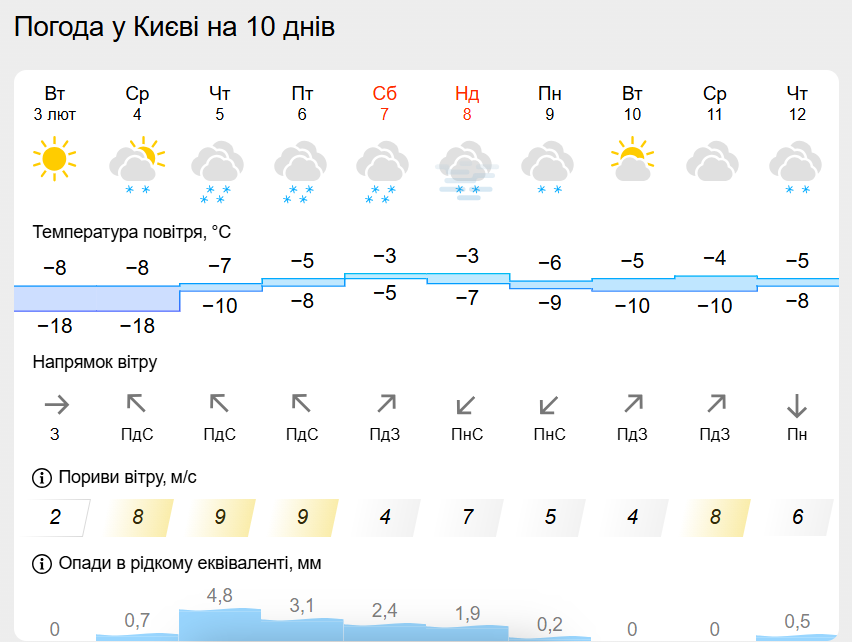За даними одного із метеорологічних ресурсів, із 4 лютого в Києві очікується послаблення морозів – мінімальна температура сягатиме близько -17°С, а вже 7 лютого нічні показники можуть підвищитися до -4°С. Втім, таке потепління буде нетривалим: із 8 лютого температура знову почне знижуватися – до -8°С. Надалі холод лише посилюватиметься, і 11 лютого синоптики прогнозують морози до -19°С.